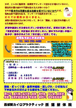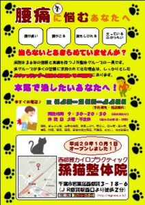 開院に当たって、同じJN整体グループで開院時期が近い、腰痛専門をうたっている鵠沼カイロプラクティック西村整体院の西村先生の作ったチラシを参考にして、西都賀カイロプラクティック孫猫整体院のチラシを作成しましたが、遂に使い切ってしまいました。