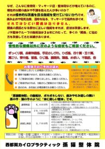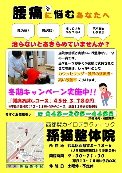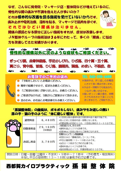 孫猫整体院の所属するJN整体グループの整体院はどこも、諸症状(頭痛・首痛・肩痛・背中痛・腰痛・肘痛・膝痛・手足しびれ等)に対応出来ますが、腰痛及び腰回りに起因する症状に対する施術は特に強いので、初版・第2版のチラシに引き続き、今回も強調してみました。o(=`・ω・´=)o
